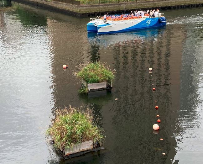 そこで、私たちは港区に提案し、芝浦の水辺にカルガモが巣を作るヨシ原の代わりに、葦(ヨシ)を植えた筏を浮かべました。