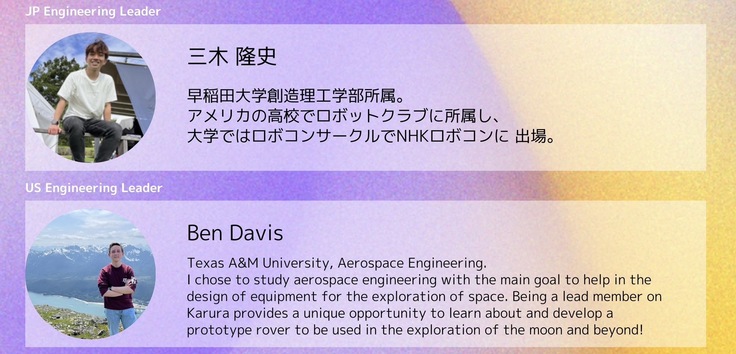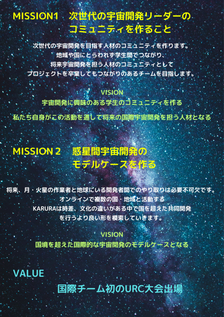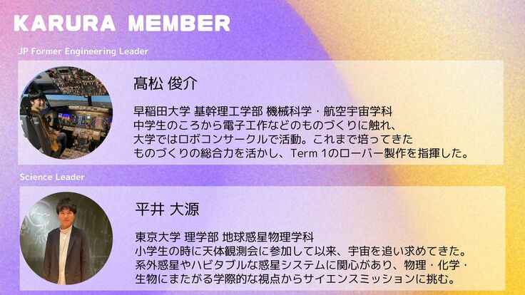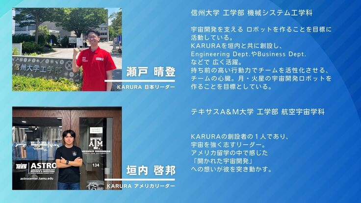 KARURAは 月・火星での宇宙開発を支える探査機(ローバー)作りを目標にする瀬戸と 自由な宇宙開発を実現したい垣内 によって作られました。