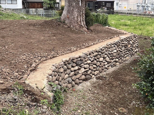 外周の石垣工事、整地などは終わりましたが、フェンスの改修工事と支援者の名前が入った石板建立がまだ済んでいません。