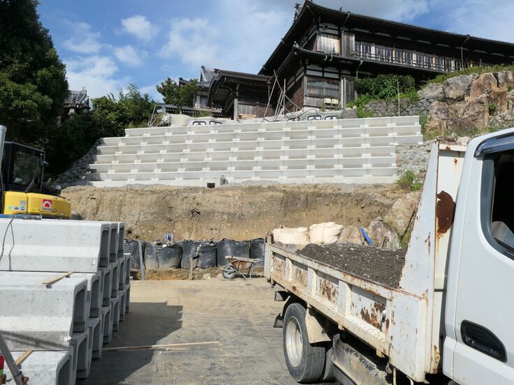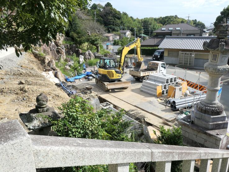 ↑こちらは横の階段から見た現在の様子です。作業が着々と進み、災害当初では、復旧の見通しがつかず、どうなってしまうんだろうかと心配しておりましたが、皆様の並々ならぬご厚意にてこうして完成の目処がたち、写真にも載っておりますように、サイズの大きい配管(u字溝)を使用し