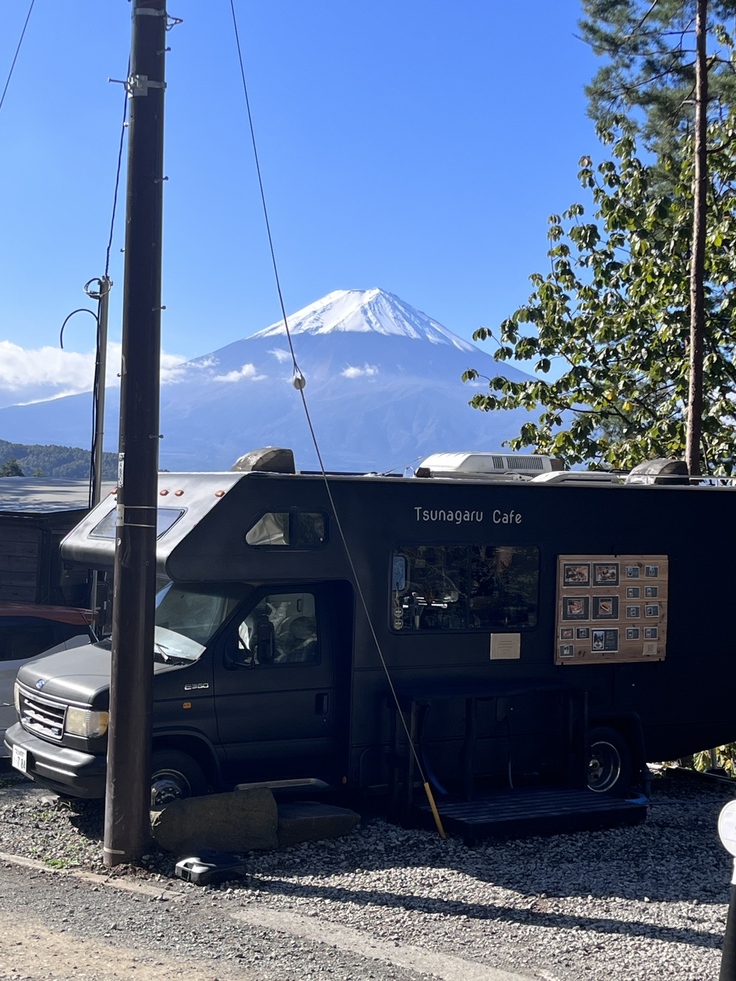 テラスで提供するための飲食を作っているキッチンカーと富士山もばっちり!