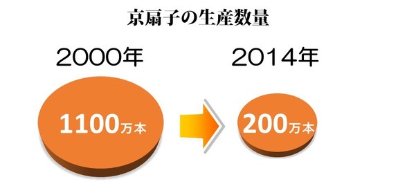 特に扇子産業の中心である京都でこの問題が顕在化しており、生産本数はこの約15年ほどの間に1/5以下の200万本まで落ち込んでいるそうです。