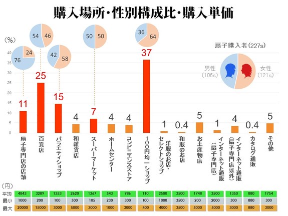 それでは引き続き生活者に焦点を当てて、扇子を買う人の購入場所や購入単価などを見ていきましょう。下記は、扇子購入者227名のデータをグラフに表したものです。