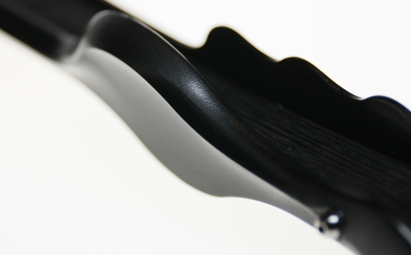 見るからに複数の指の置き場所として使用者を誘うデザインです(笑)。しかし、指を添える部分が三つあるからといって、三本の指の先を全てこの部分に添える必要はありません。手が大きい人でも小さい人でも、ストレスなくお使いいただけるように最も収まりのよいどこかに添えるようにしてください。使っている内にご自身のベストポジションが見つかるでしょう。