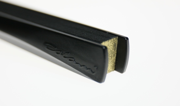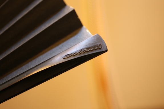要の大部分は肉厚の親骨に埋まっていますので、指が触れても気になることはありません。この写真の下側のなだらかな曲面は扇子を閉じた時も中指と薬指が気持ちよく収まるように出来ています。これからもずっと京都で作って頂きたいという願いを込めて、人差し指がかかる部分に「made in KYOTO」を刻んでいます。