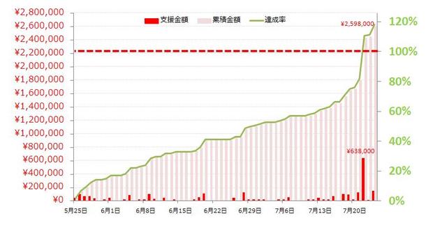 先ずはご覧ください。このグラフの数字の動きを見るだけで、私の頭の中では色々な事が走馬灯のように浮かんでは消えます。あの苦しさと嬉しさが複雑に入り混じった2カ月を思い出し、ちょっとだけ気持ち悪くなってしましたが、どうやら苦しさ要素の方が多かったみたいですね(笑)。本当に、皆様とご縁を結ばせて頂き、クラウドファンディングを達成させていただけたことが奇跡のように思えます。