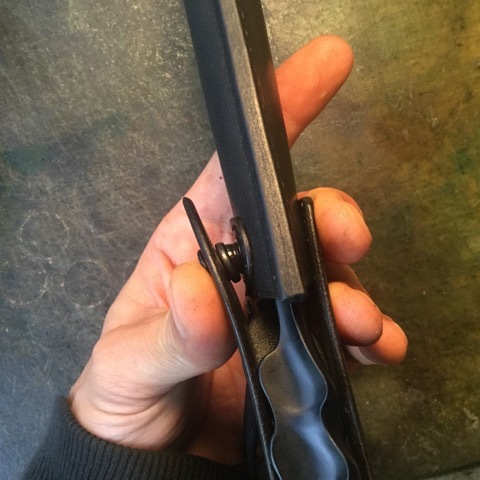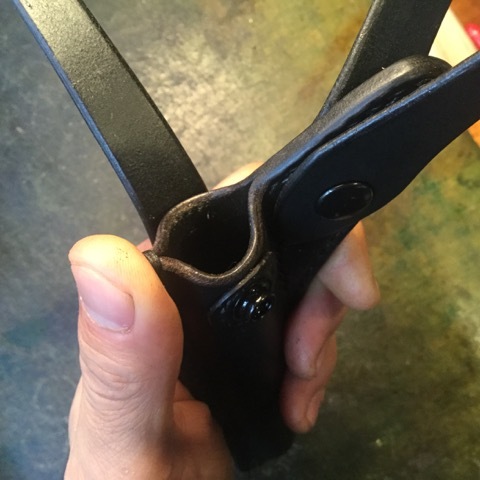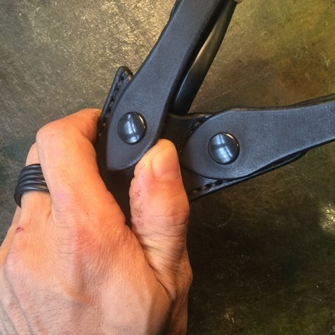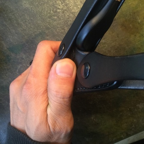 ⑤開けるときは写真の位置に指をかけ跳ね上げてください。よりホックに近い位置で力をかける事により、革への負担を軽減します。