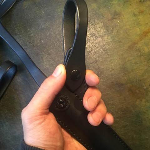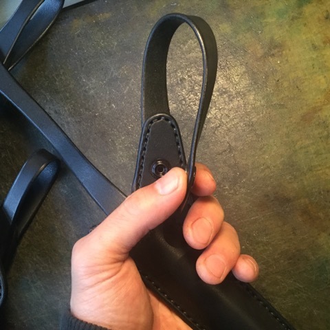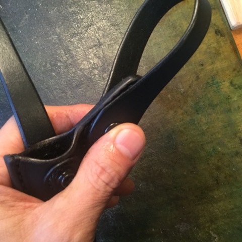 ⑥ベルトループや鞄に着ける際にはこちらのホックをお使い下さい。閉めるときはパチっと音が鳴るまで閉めてください。開けるときは、ストラップの上部に指をかけて跳ね上げてください。指をかけやすいようにセンターよりも若干上へ上げておりますので革への負担も軽減されます。