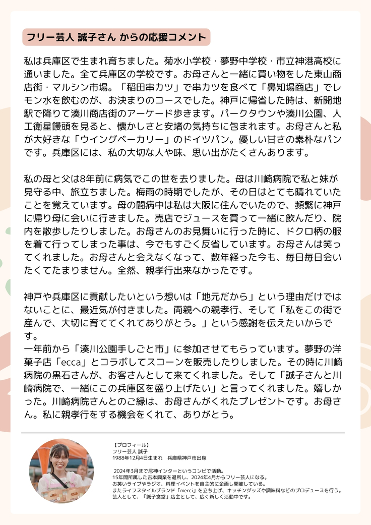 誠子さんが「みんなの救急車プロジェクト」開始に際して寄せてくださった応援コメントがあります。こちらも地元への愛、そして家族への愛にあふれていて、とても素敵です。