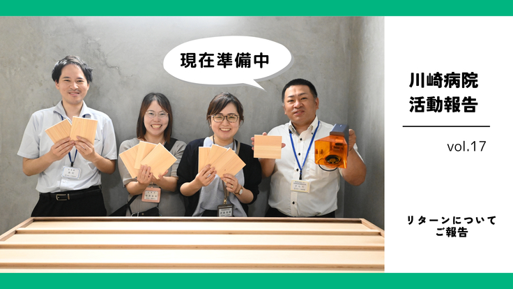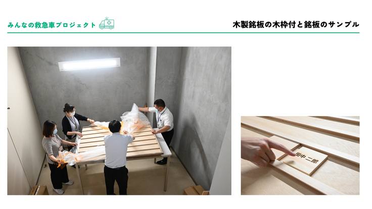 銘板の制作にあたり、木材には高級感とレーザー加工時の文字の見やすさを考慮し、ヒノキを選定しました。先日、加工用のプレートが準備できましたので、掲載するご芳名の最終確認後、プロジェクトメンバーが一つひとつレーザーで加工していきます。加工が終わり次第、全ての銘板を木枠にはめ込み完成となります。完成した銘板は、病院内の人通りの多い場所に掲示できるよう、現在場所を調整中です。(9月上旬完成予定)