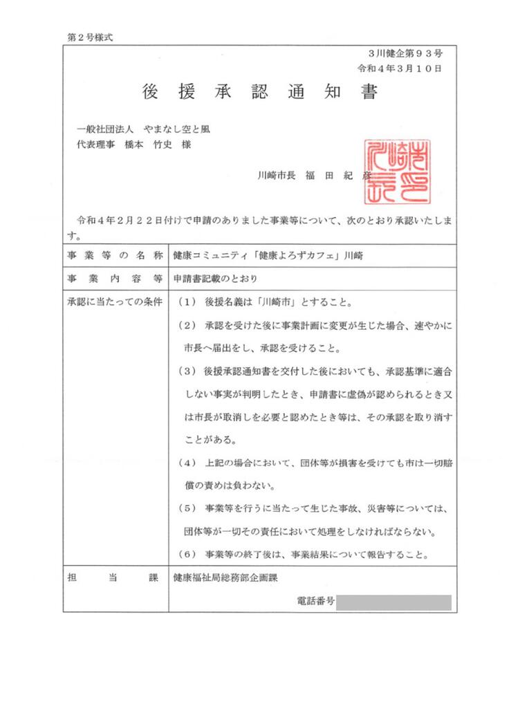 本日、川崎市から、健康よろずカフェについて、後援承諾通知書をいただき、正式に、川崎市が後援していただくことになりました。