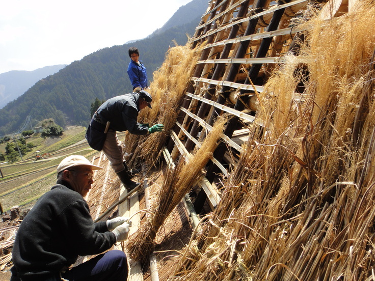 Once the materials are in place, it is time to start the thatching process, which is traditionally done in late February when there is little rain since the entire roof is removed. While the actual re-thatching is laborious, a lot of power is also need to prepare the thatch on the ground and pass it up to the top. Other help to collect and dispose of the thatch. In the old days, people from each house in the village would come out to help, and they would maintain the roofs of everyone in succession, “this house this year, that house next year” and so on. This culture of mutual help and support is called "Temagai" in Kamikatsu. It's a way of paying each other back through labor, not through money. Since the Hanano residence is currently the only thatched roof in the town, there is no one to come and replace the thatched roof. The 2012 revival of the thatched roof was completed because of the commitment of the elders, who had inherited the knowledge and skills of thatching, and generosity of volunteers to help with the labor.