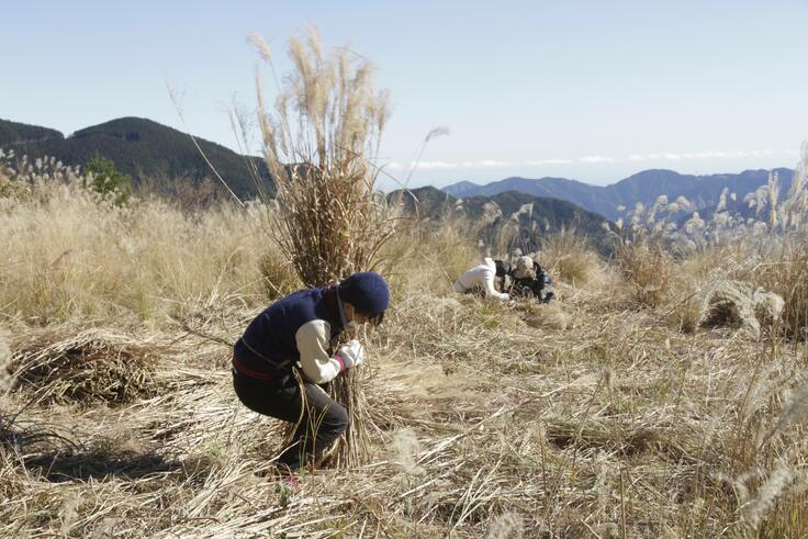 まず、材料の確保。屋根の1面を葺き替えるのに必要な茅束は1000束と言われています。多くの家が茅葺き屋根で、集落の共同の茅場があった昔と異なり、まずは茅場を探すところからはじまります。1回全部刈り倒し、2年目から使える茅を集めることができるようになります。