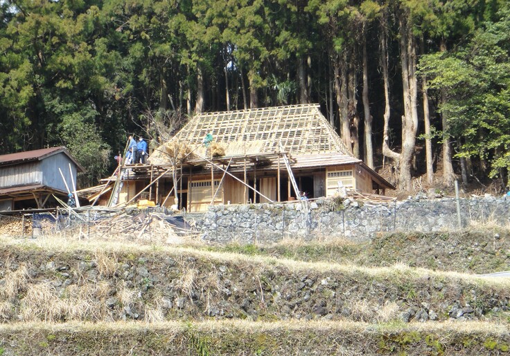 初代校長だけでなく茅葺きの知識を持つ方々の減少により、作業の全体を把握して的確な指示をできる人材が足りず、今回は徳島県東祖谷地域の茅葺きができる業者さんに協力を依頼しました。 業者さんは、あくまでリーダーは上勝のおじいちゃんであり、「八重地の葺き方」を再現することを理解してくれた上に、良心的なお見積もりを頂いています。