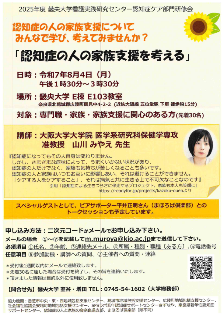 次の取り組みとして、畿央大学看護実践研究センター認知症ケア部門研修会を開催できる運びとなりました。