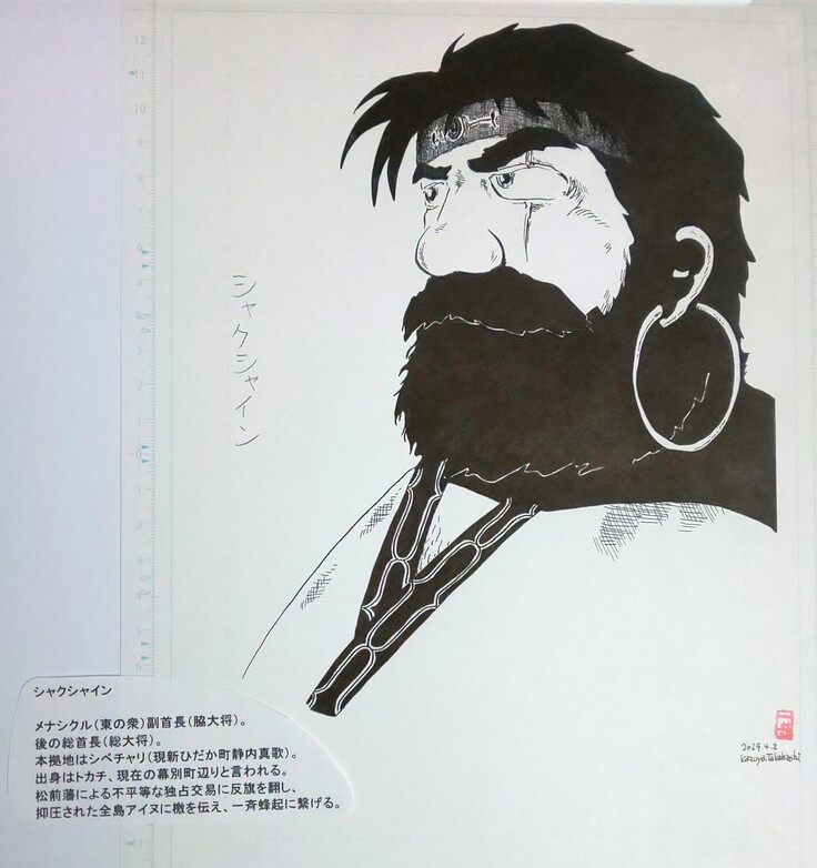 寛文九年蝦夷蜂起の首謀者。文字を持たず、部族間抗争も絶えない北海道のアイヌをまとめ上げ、共通の敵松前藩に一斉蜂起を起こす手腕は本作の最大の見所です。