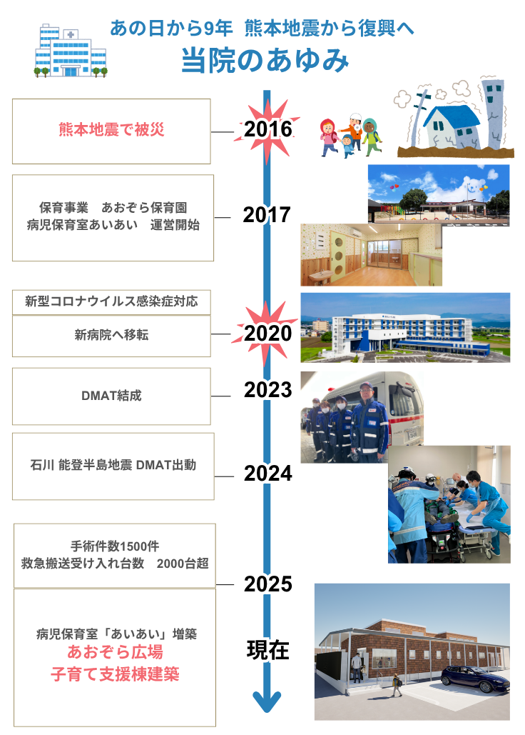 2016年の熊本地震では、当院も大きな被害を受けました。しかし、地域の皆様の支えのもと、2020年には新病院へ移転。その後も、新型コロナウイルス感染症との闘い、そして2024年の能登半島地震へのDMAT派遣と、私たちは常に地域の“いのち”と向き合い、困難を乗り越え、歩みを進めてまいりました。