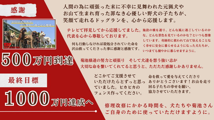 3月31日に開始したKDPのプロジェクトですが、5月14日に第一目標金額の500万円を達成することができました。皆様からの応援、ご支援はとてもありがたく、感謝の気持ちでいっぱいです。お山の犬たちと共に、心より御礼申し上げます。