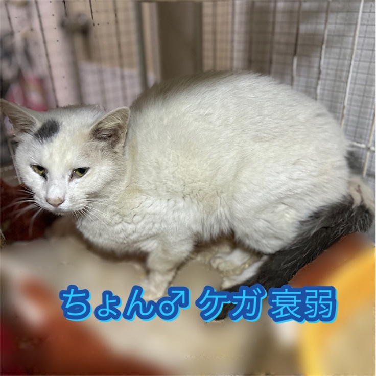 ●ちょん、しっぽの付け根に怪我をして、カラスにつつかれていたところを保護されました。動物病院でお薬をもらいましたが、翌日ひどく脱水している状態だったので、病院で抗生剤の注射とリンゲル補液をしてもらいました。脱水で目は落ち窪み、痩せて背骨がゴツゴツしていました。皮膚は硬くなり、これまでずいぶん傷を負ってきた様子、しっぽの付け根は皮膚が裂けていました。栄養をとって、少しずつ回復中です。