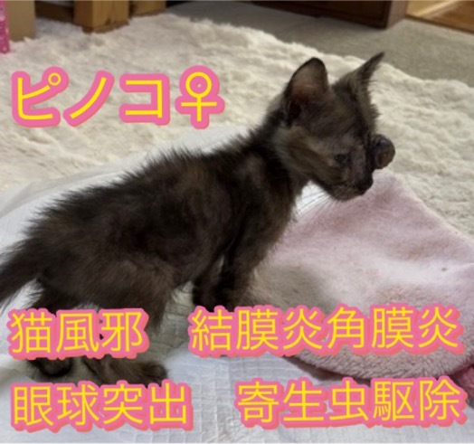 ⚫︎ピノコ♀ 8月初め、旅行中の外人さんが、街中の道端で見つけた子猫。生後1.5ヶ月ほどで体重300g。両眼が目やにでふさがって、衰弱。固まった目ヤニをふやかして剥がし、動物病院で受診。両眼とも結膜が腫れあがり、上下の結膜が奥の方で癒着。抗生剤と目薬、眼軟膏で治療。寄生虫も回虫、条虫、コクシジウムといろいろいて、何度も駆虫を繰り返し、ようやく無事駆虫できました。眼は、順調に治ってきていると思いましたが、途中から左目の眼球の中身が出てきて、すぐ受診しましたが、残念なことに左眼は失明…右眼は瞳孔反射があり、見えるようになる可能性があるそうですが、今はまったく見えていません。