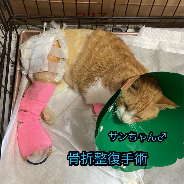 ⚫︎サンちゃん♂ 人馴れした地域猫。何があったか不明ですが、右後ろ足を骨折していました。発見時、骨折から1週間程経っていて、難しい手術になったようですが、無事に手術してもらうことができました。大きなエリザベスカラーと脚の保護具を付けてもらい、10日間入院して順調に回復しています。