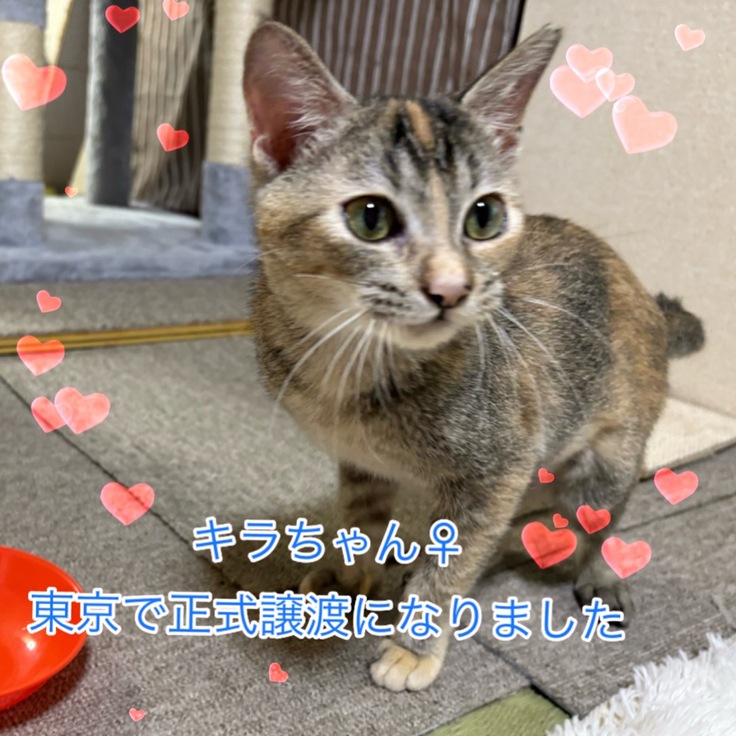 ⚫︎キラ♀ 2/10の夜、庭に捨てられてた小柄な女の子。食欲旺盛、なつこく元気いっぱい。 3月に避妊手術を受け、4月ワクチン接種して、4/12に東京に行きました。保護活動されてる方のお世話になり、里親様決まったそうです。幸せになあれ❣️