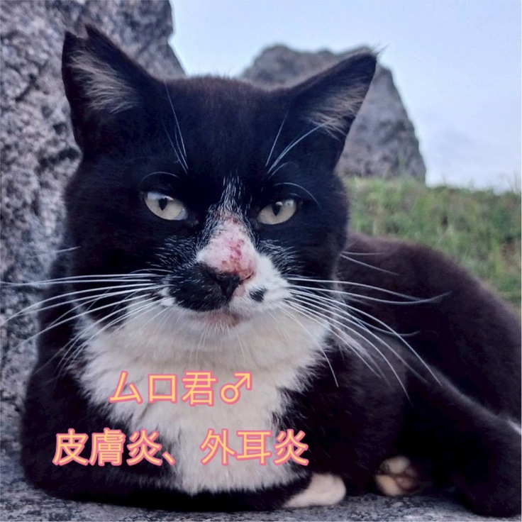 ⚫︎ムロ君♂ 地域猫さんです。以前から身体のあちこちに脱毛、皮膚がただれ血が滲んでいました。今回は、抗炎症剤の注射で改善してきました。外耳炎もあり、点耳薬もらいました。