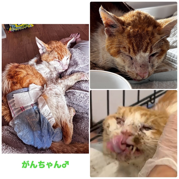 ◉がんちゃん 下顎が割れて口はゆがみ、かなり衰弱、目やに鼻水もひどく、脱水状態で保護。血液検査、ウイルス検査エイズ陽性。抗生剤注射、リンゲル補液。血液検査の結果も悪く、数日で看取りになるかと思われましたが、補液後、食欲も出てみるみる良くなっています。割れた下顎は、少し体調が良くなってから手術してもらう事に。がんちゃんを発見した方とお世話ご協力のお申し出くださった方もあり、お世話と病院搬送をして頂いているので、医療費を出させて頂きました。辛い思いをしてきた猫さんには、本当に幸せになってほしいです。
