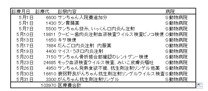◉サンちゃん 骨折整復手術後の状態確認のためレントゲン、下痢のため検便、その後、40.6度の高熱を出し、咳も続いて食欲不振で受診。抗生剤注射、リンゲル液、内服薬整腸剤と抗生剤を貰いました。3日ほど高熱が続きましたが、抗生剤が効いたようで、良くなってきました。