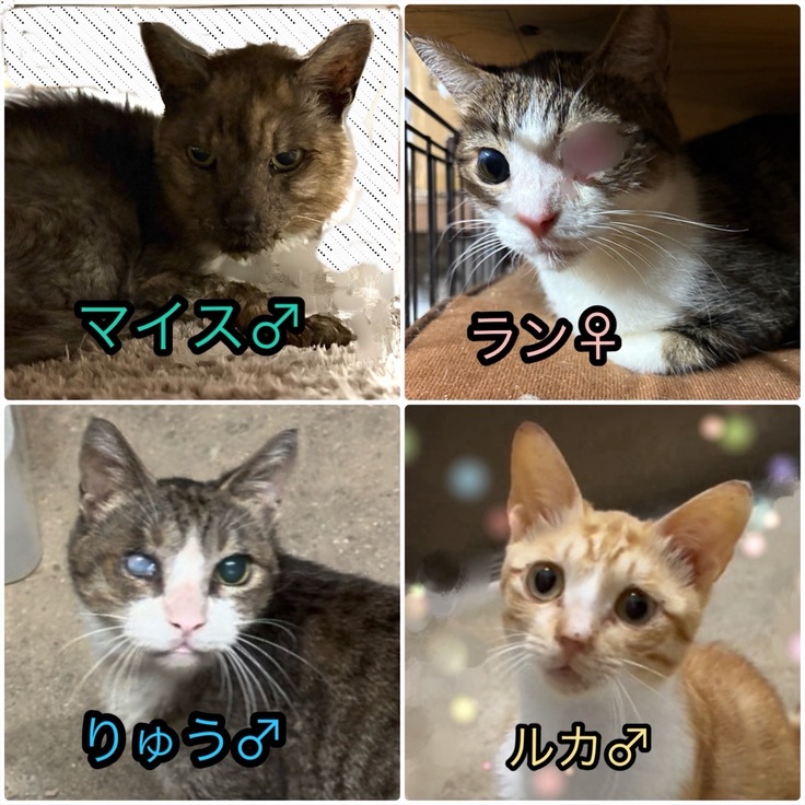 ⚫︎ラン もともとはとても美しい瞳をしていたのですが、角膜潰瘍が急激に悪化(痛々しい状態なので、写真にはモザイクをかけてあります)左眼球は肉の塊のようになり、血も滲んで痛みのせいか食欲不振に…。とても心配で、急ぎ受診しました。目薬を変更、根気良く目薬をさしていけば状態は落ち着くとのことで、1日4回の目薬を2種類と、1日2回の目薬をランにがんばってもらいました。ちゅーるひとなめしたら目薬をさし…それぞれ5分あけて次の目薬と繰り返し、あまり嫌がらず続けることができ、状態は落ち着いてきました。左眼は見えなくなってしまいましたが、現在、痛みはほぼないようで食欲も旺盛になりました。時々嘔吐と下痢があるので、胃の薬と下痢止めももらいました。