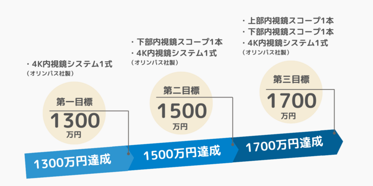 ※本プロジェクトは、支援総額が期日までに第1目標金額に届かなかった場合でも、第1目標金額分を自己負担するなどして、必ず内視鏡システムの購入を実施いたします。