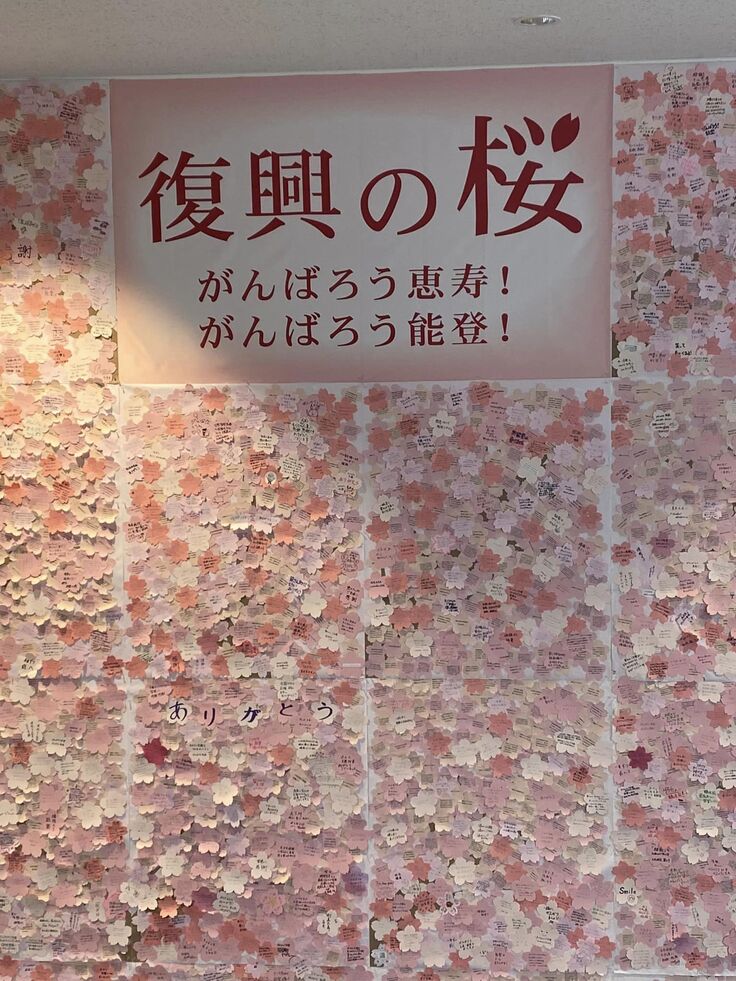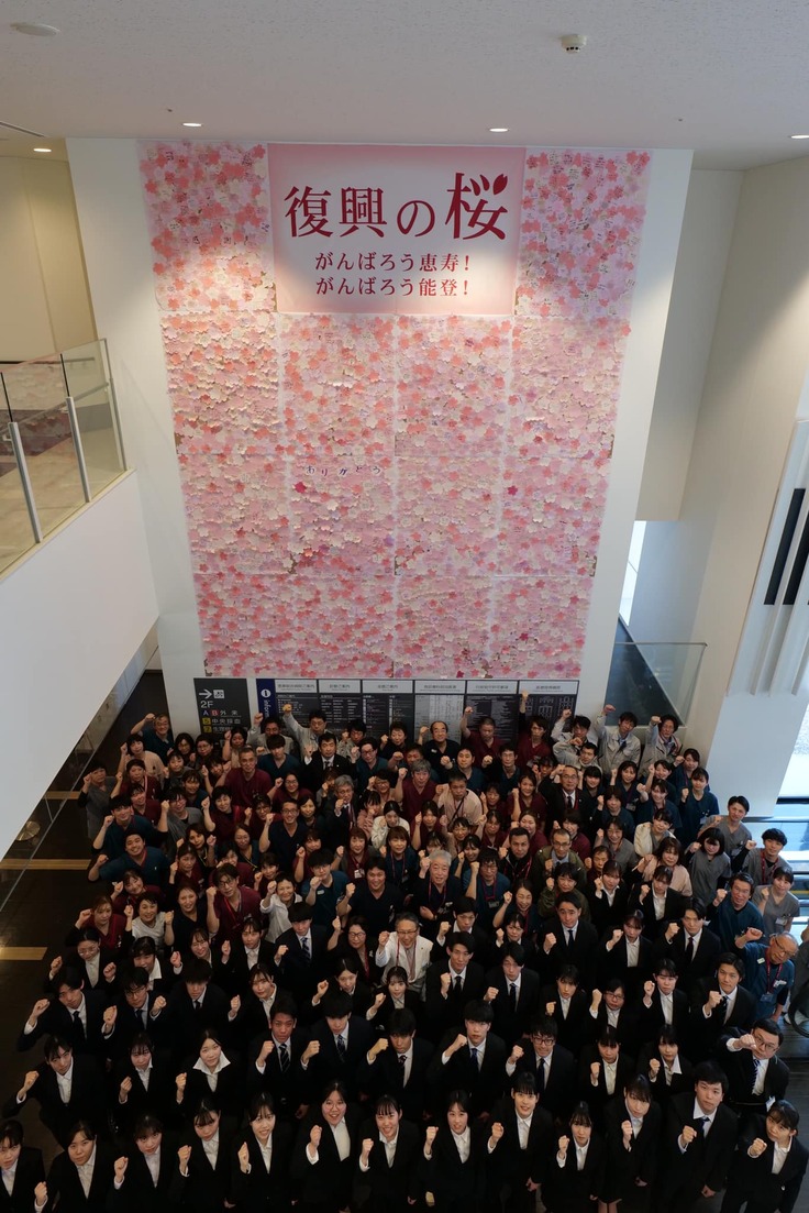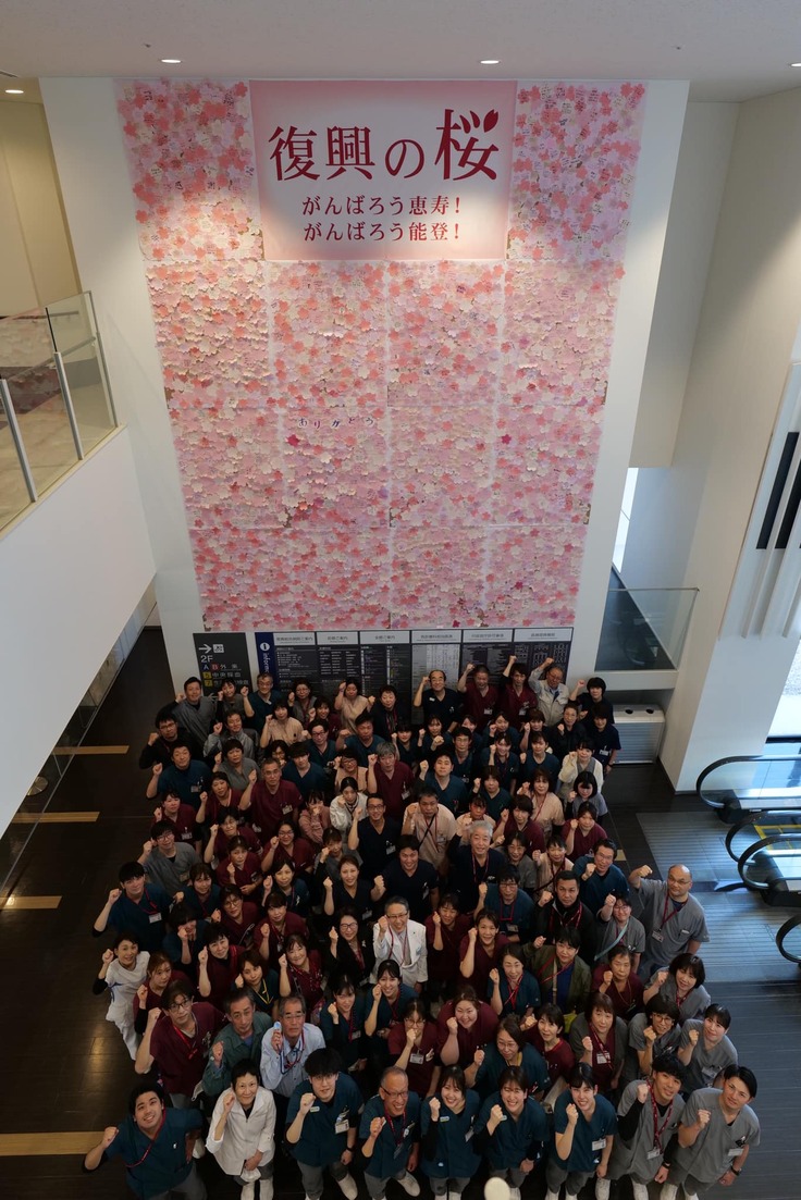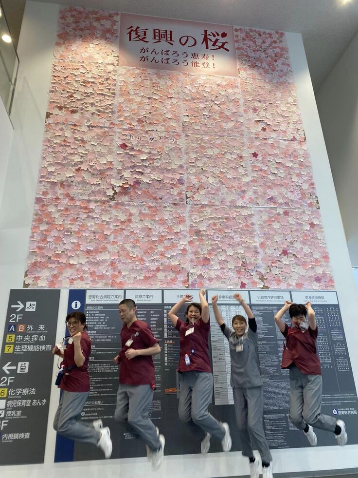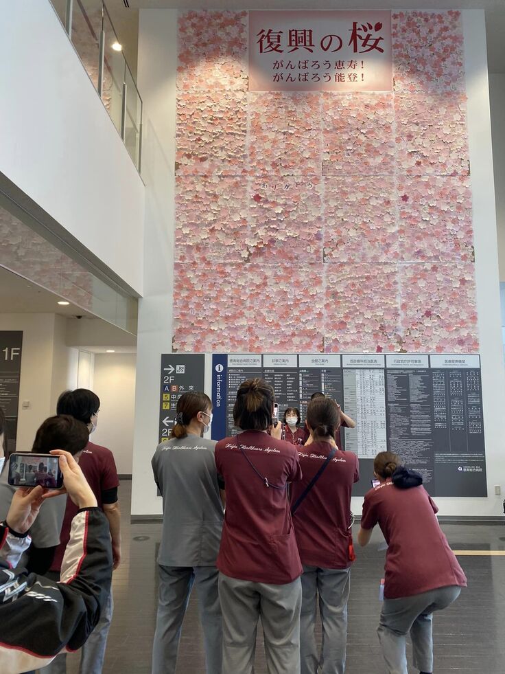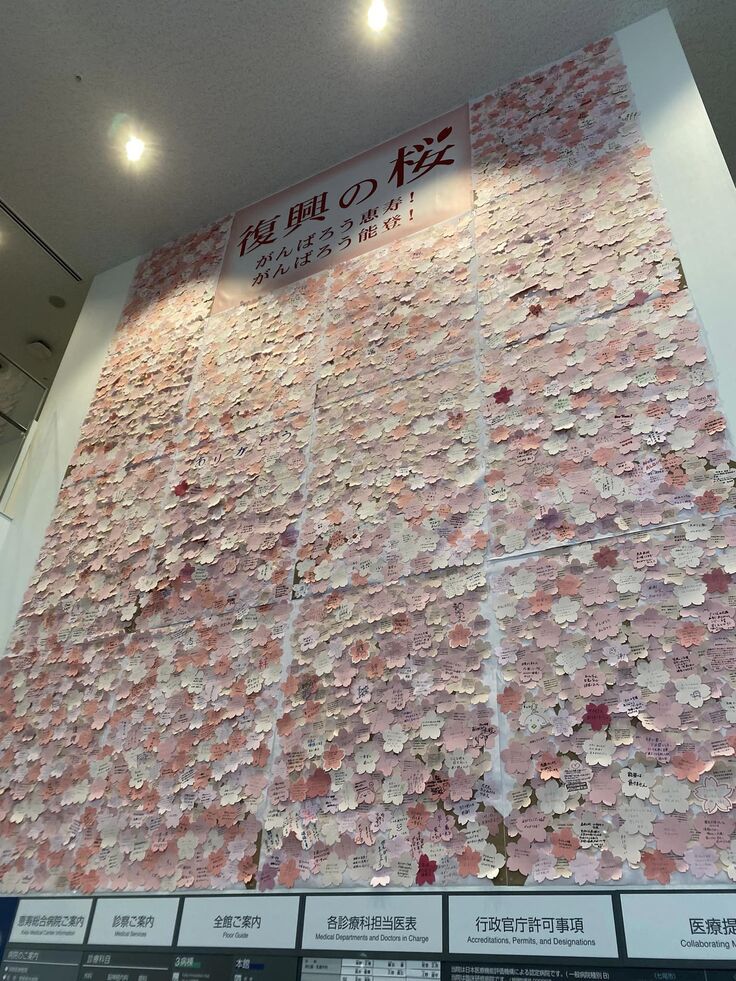 クラファンの応援メッセージを桜の花びらにのせて、さらに恵寿総合病院を始め法人内関連施設に飾られ、訪れた方々からの応援メッセージもたくさん頂き、本日恵寿総合病院のエントランスの壁にドドーンと満開の復興の桜が咲きました。応援コメントつきの花びらは5000枚以上です