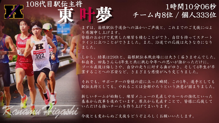 箱根予選会に至るまで、多くの方々にSNS通じてご声援を頂いた形となりましたが、大会期間を通してSNS等に頂くコメント全てに目を通させて頂いておりました。