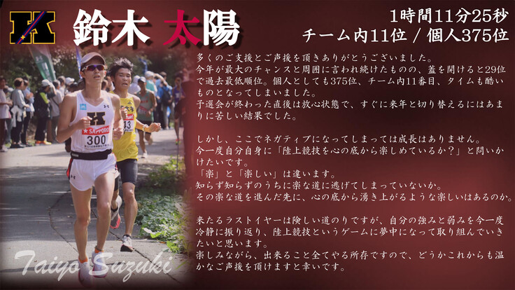 そして、予選会当日は朝早くから現地まで足を運んでいただき、ご声援を送っていただいたことは非常に大きな力となりました。