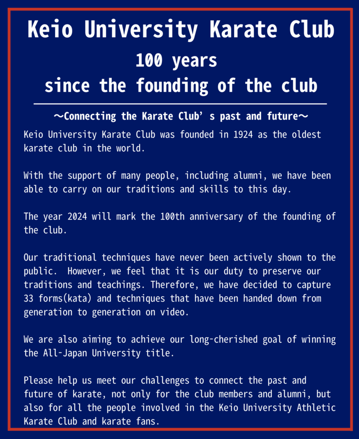 We want to connect the past and future of karate through crowdfunding, not only with the club members and alumni, but also with all the people involved in the Keio University Karate Club and karate fans.