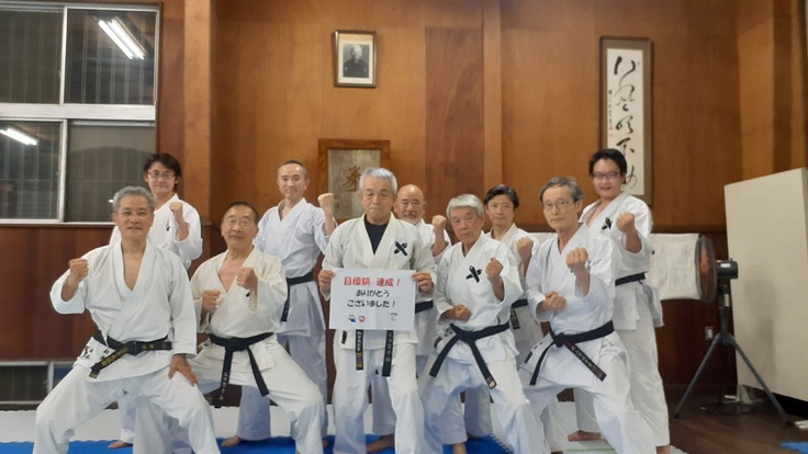 船越師範「お写真」と直筆「拳」の額の前で。目標達成のご報告。
