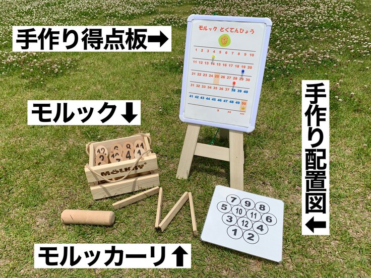 ・モルック1セット(約5,000円(税込))をamazonで購入。モルックの得点板を手作りで制作。ホワイトボード・木の脚・マグネットなど約1,500円(税込)。モルッカ―リ(投げる位置を示す、モルック専用の仕切り)を手作りで制作。木の棒、ゴムなど約500円(税込)。計約7,000円(税込)。