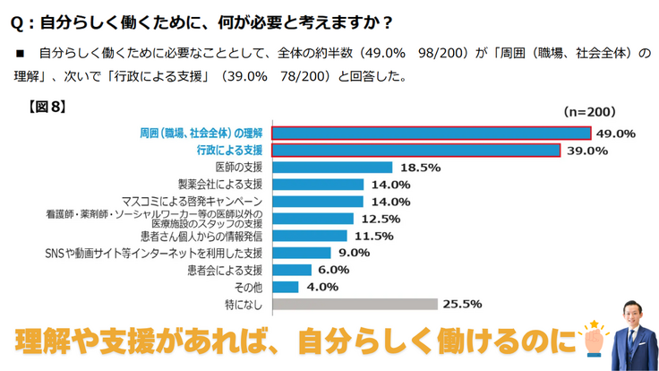 また、疾患リテラシーの不足も深刻です。学校や企業においてIBDの症状や特性が理解されず、必要な合理的配慮を受けられない事例が多発しています。これにより、患者さんは「理解されないこと」から社会的孤立や自己肯定感の低下に繋がり、病気と共に生きることに希望を持ちにくくなる現実が存在します。