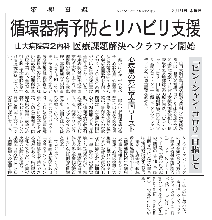 山口大学医学部附属病院の所在地である宇部市の地域紙、宇部日報の一面で当科の取り組みを取り上げていただきました。