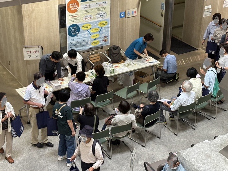 心臓病にも、腎臓病にも、塩分の過剰摂取は大敵です。そんな塩分を摂りすぎず、塩分の排泄を促進するカリウムをしっかりと摂ることが重要であり、共催していただいた宇部市ではへら塩(塩分を減らす)、ベジ宇部(カリウムの多く含まれる野菜を増やす)作戦が進行中です。慢性腎臓病啓発ブースではお集まりいただいたみなさんの尿からナトリウム・カリウム比の計測を行い、当科から澁谷講師が参加したほか、なんと学部学生さんも協力にかけつけてくれました。