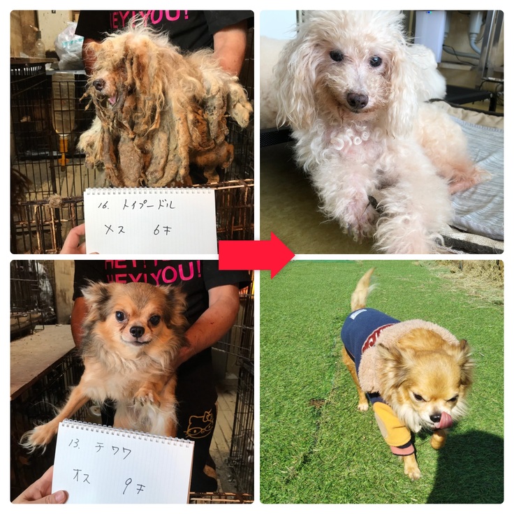 ポエは右後ろ足が動きませんでしたが、16歳(推定)で旅立つまで元気に力強く生き抜いてくれました。リーベは皮膚の状態がとても悪かったのですがいまではすっかり回復。里親さんの元で幸せに過ごしています。