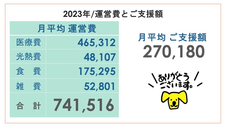 シェルターでは治療にかかる費用が月平均47万円、そこに光熱費5万円、食事・サプリメント他18万円、その他雑費5万円を合わせると月平均約75万円の運営費がかかっております。