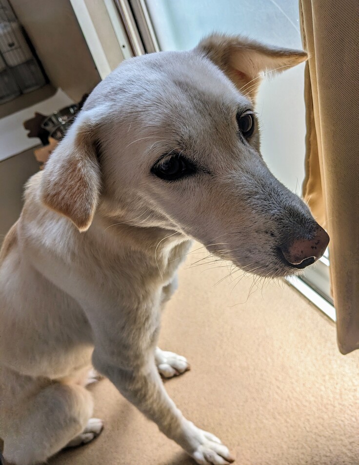 よく一緒にお散歩に行くボランティアさんがやってきたのを見つけて、早くも期待の目でドア前待機のこはるさん