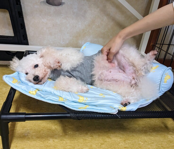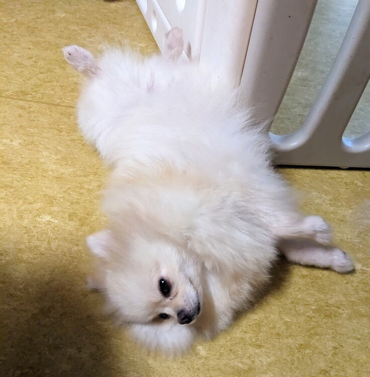 おすましな新犬のモモちゃん、めずらしくひっくり返っています