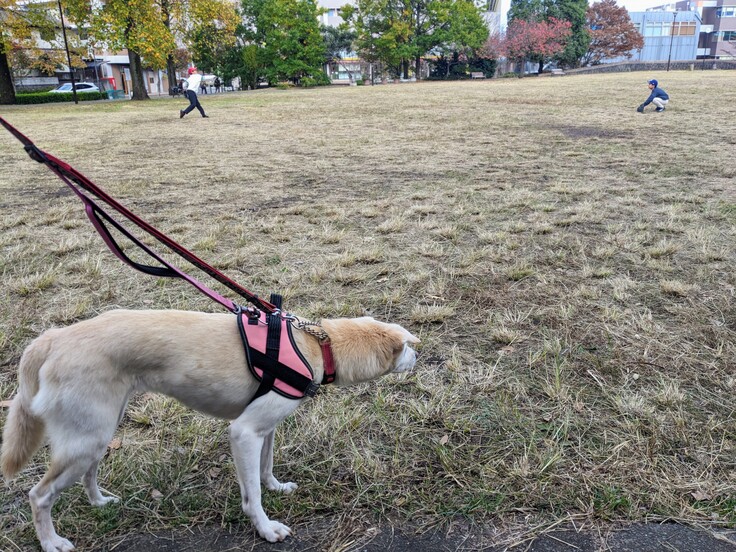 朝のお散歩中、突然足を止めて少年達のキャッチボールを観戦し始めたこはる
