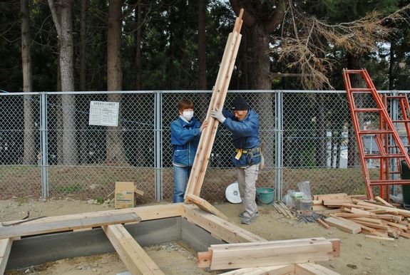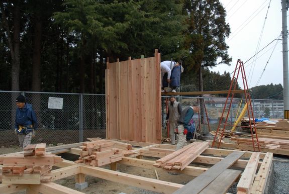 専門的になってしまいますが、コンクリ―トの基礎に桧材の土台を敷き、土台にホゾ穴を開け、その穴に柱のホゾを差し込みながら建てます。窓や出入口の無い壁だけの部分の柱は、柱間隔を45㎝ごとに建て、柱と柱の間に幅36cm、厚さ3㎝の杉板を縦に挟み込み、壁と柱を作っていきます。