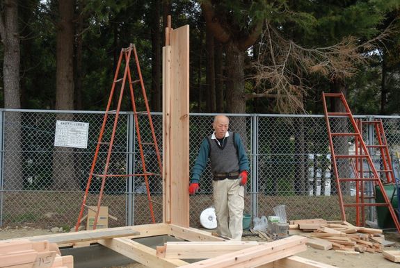建物を支える主要構造は手を省くことはできません。さらには内装材の素材も無垢の木で表現したいと言う思いでいっぱいでした。しかし、現地に滞在し工事ができる日数は限られていました。そこで今回の、□===□===□の柱・板・柱の頑丈な構造は、無垢の木をそのまま表す内装仕上げと、施工期間の短縮と言う、丈夫な木の家を短期間でつくり、リユースが出来ると言う願いを叶えられた「アイデアいっぱいの談話室」となっているのです。