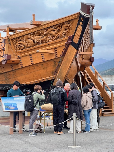 干鮑(乾燥あわび)、イリコ(乾燥なまこ)、フカヒレ、いわゆる俵物三品の現物や、荷物を入れるための袋である「カマス」、船体の外側から船室まで気仙丸を見学。質問なども多数いただき、とても熱心に興味をもって聞いてくださいました。