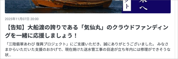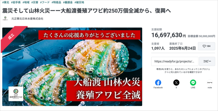 同じ大船渡市内で今年度クラウドファンディングを実施した「元正榮北日本水産(株)」様より、活動報告にて周知していただきました!