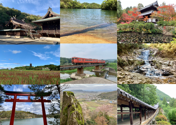上段左から吉備津彦神社、重田池、井山宝福寺。中段左から備中国分寺、JR吉備線、血吸川。下段左から龍王池、吉備の中山、吉備津神社。